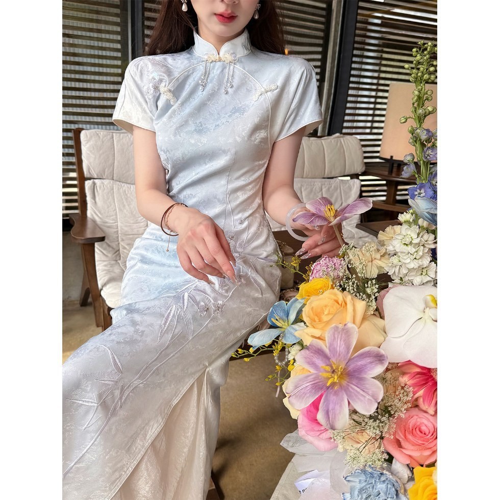 This elegant blush pink qipao evokes the charm of traditional Chinese watercolour paintings, blending soft artistic brushstrokes with timeless tailoring. The gentle ink-wash effect flows organically across the satin-like fabric, giving the dress a tranquil and poetic aura. Featuring a high mandarin collar, short sleeves, and asymmetric red frog buttons, it gracefully enhances the neckline while adding a touch of heritage detail. The fitted silhouette flatters the figure, while the side frog button closure highlights its classic craftsmanship. Ideal for cultural gatherings, tea ceremonies, or serene garden strolls, this dress beautifully captures the balance between simplicity and sophistication.