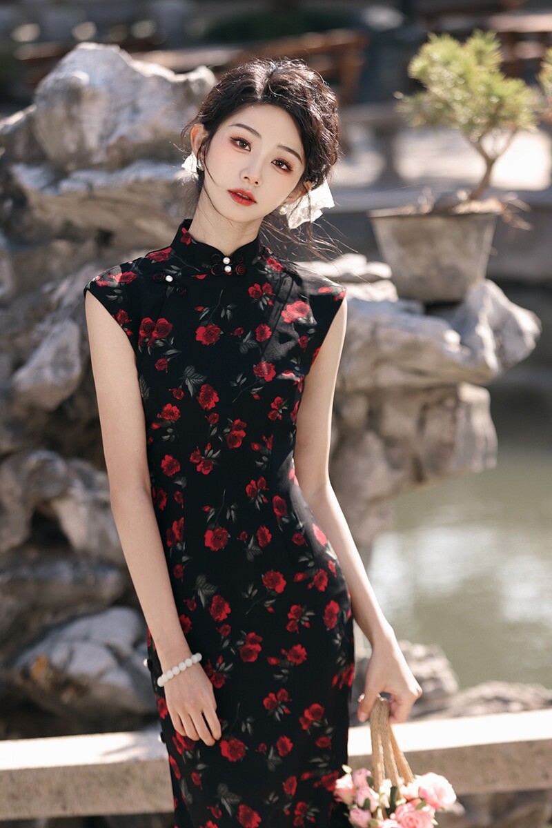 Eternal Blossom: Elegant Black Chinese Qipao Cheongsam Dress in Floral Chiffon