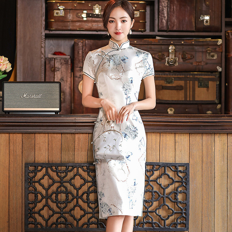 New Chinese White Blue Blossom Floral Prints Satin Short Cheongsam Qipao Dress