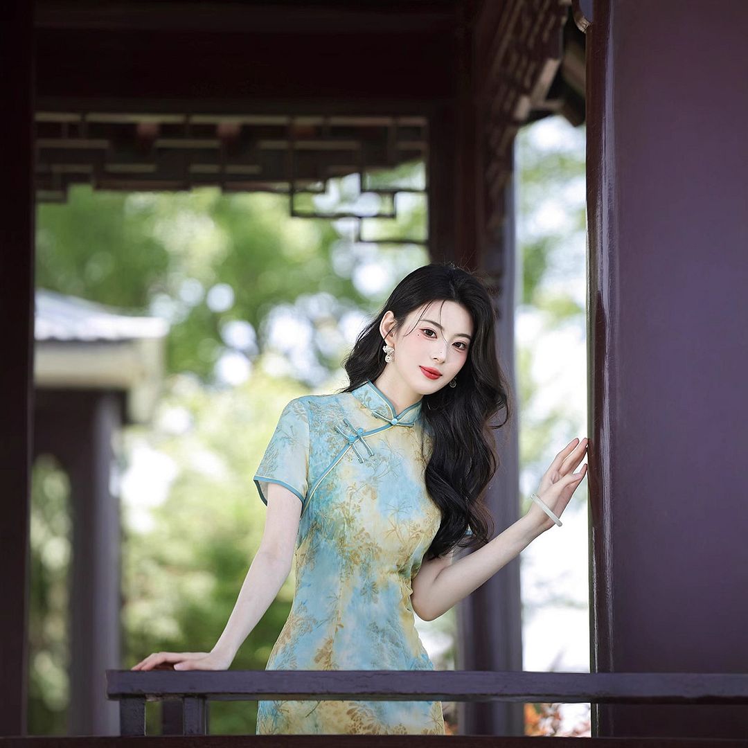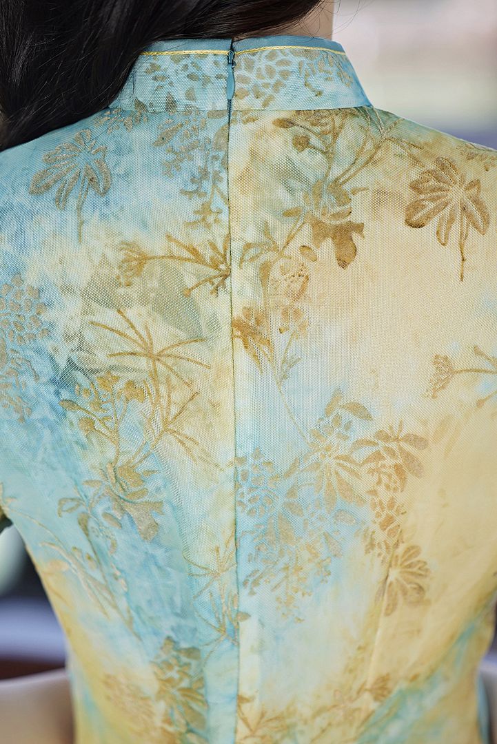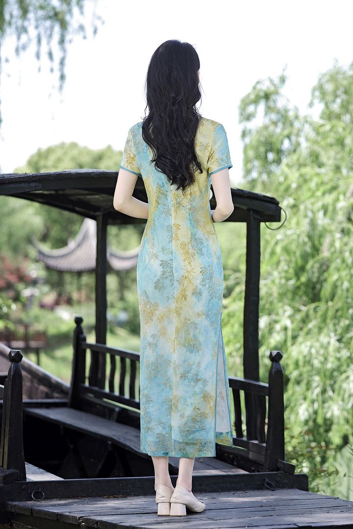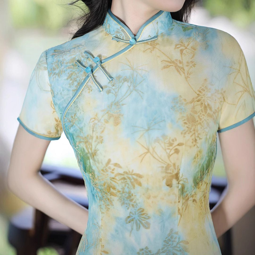 Gracefully blending modern charm with oriental elegance, this captivating qipao showcases a dreamy gradient of seafoam blue and soft gold tones. The fitted silhouette hugs the figure while the intricate floral brocade shimmers subtly under light, creating a refined, ethereal effect. Classic elements like the Mandarin collar and handmade frog buttons complete the look, while the side slit ensures ease of movement. Perfect for garden weddings, tea parties, or Chinese festivals, this cheongsam evokes a sense of timeless femininity.