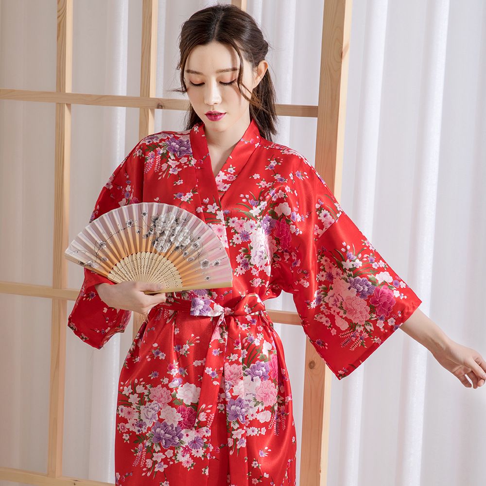 Elegant Japanese Chinese Satin Red Floral Design Ladies Kimono Style Bathrobe