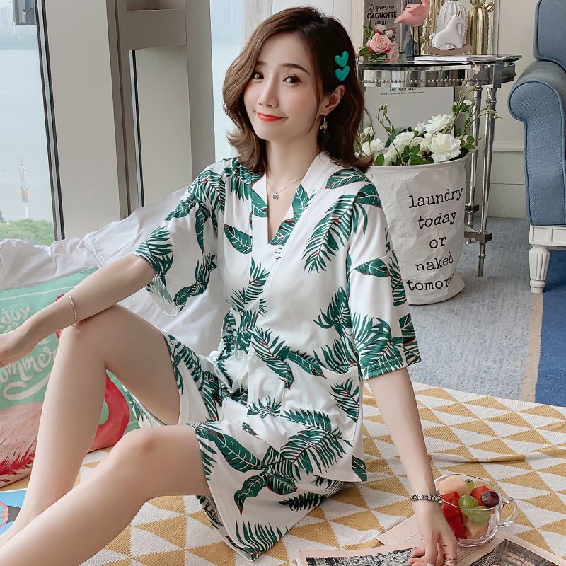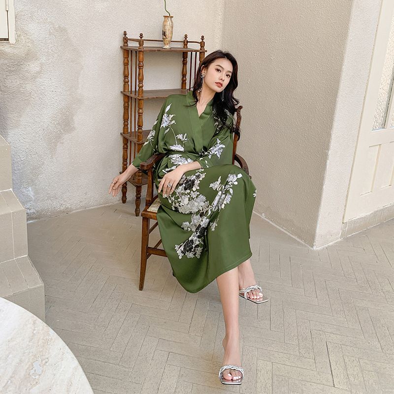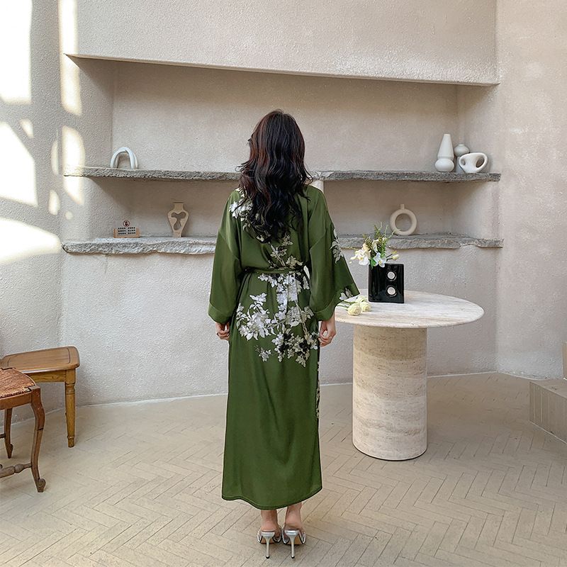 In this moss green floral Chinese Japanese kimono gown, you'll find your place.