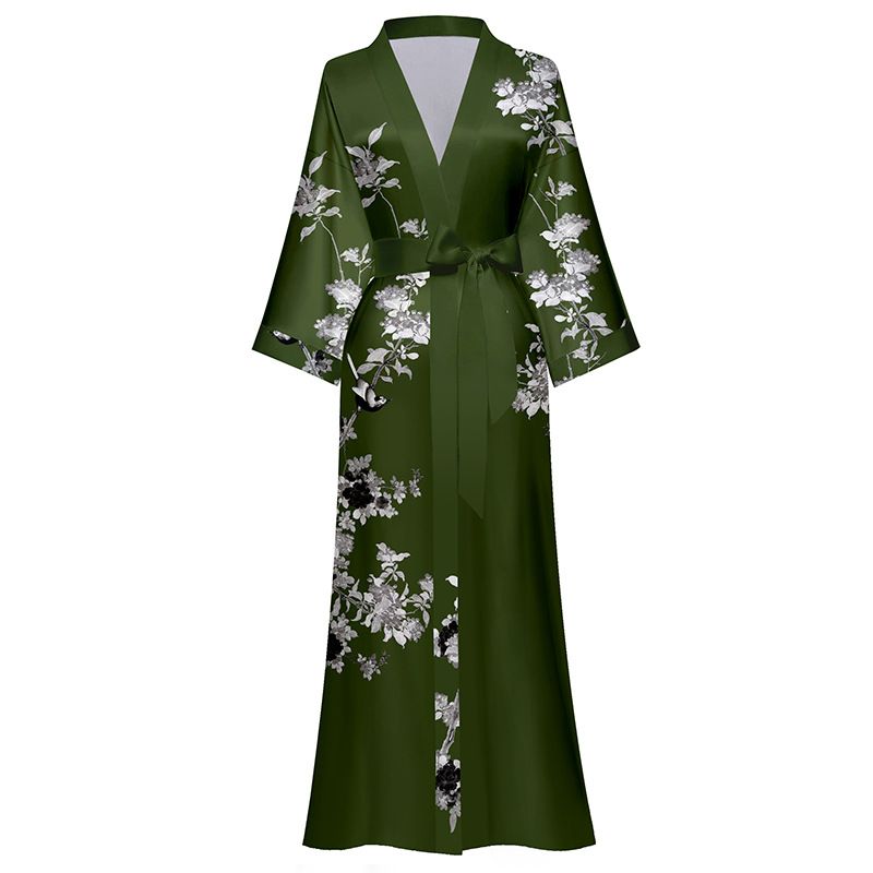 Elegant Ladies Moss Green Floral Chinese Japanese Kimono Long Nightgown Bathrobe