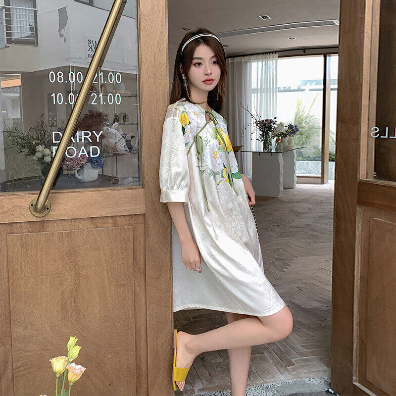 In this ivory white floral print Chinese style knee length nightdress, you'll find your place.
