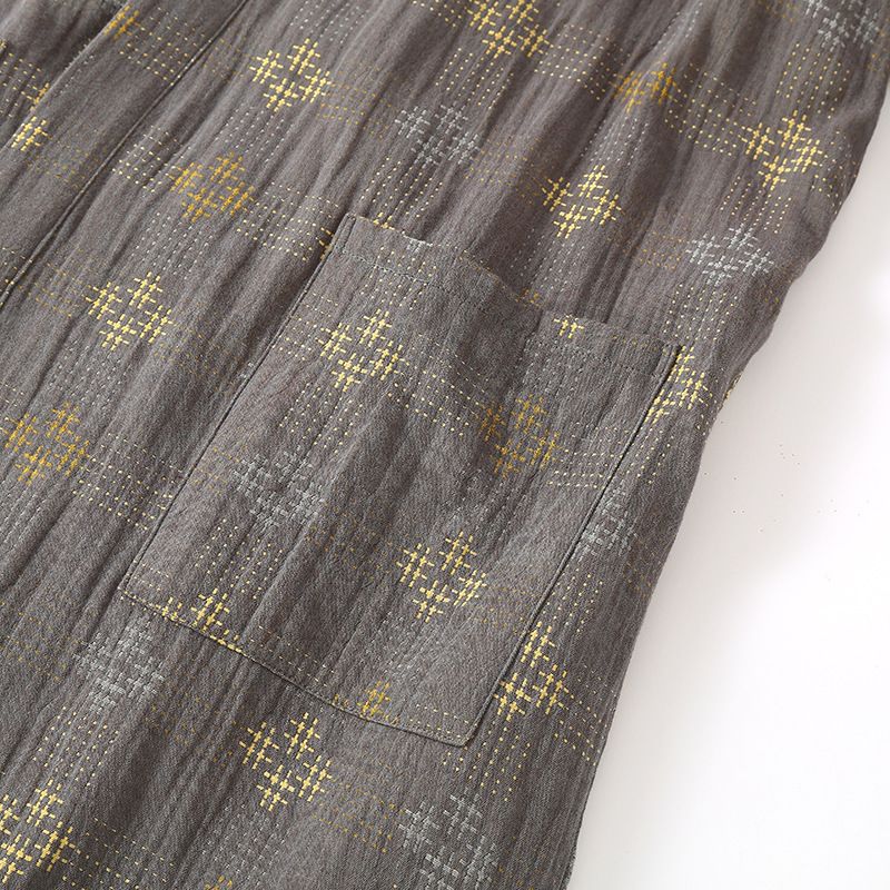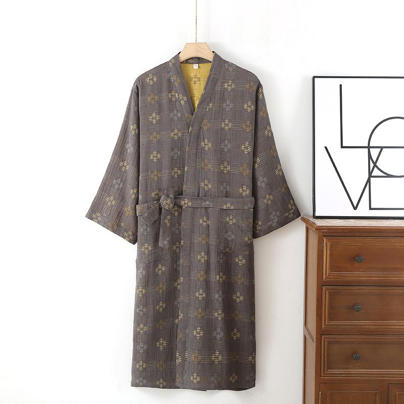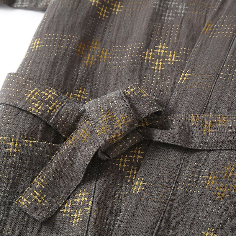men?s kimono robe, brown robe for men, cotton linen robe, cross stitch pattern robe, modern Japanese robe, men?s spa robe, ethnic style dressing gown, breathable housecoat men, yellow lining robe, geometric robe men, minimalist robe for men, lounge robe men, soft cotton robe, kimono dressing gown, gift for dad