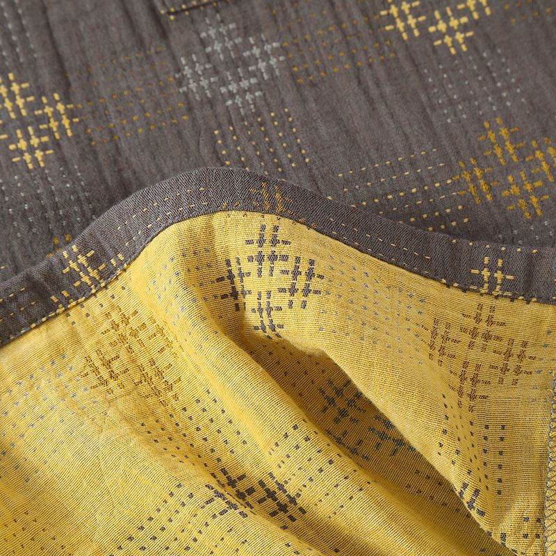 Elevate your downtime with this refined men?s kimono-style robe, crafted from breathable cotton-linen in a deep coffee brown tone. Embellished with subtle gold and grey cross-stitch-style patterns, the robe features a soft inner lining in contrasting yellow for a contemporary pop. The lightweight texture and mid-length design make it ideal for year-round lounging. Complete with a matching belt and front pockets, this robe combines Japanese-inspired tailoring with modern textile appeal?perfect for mornings, spa days, or laid-back evenings at home.