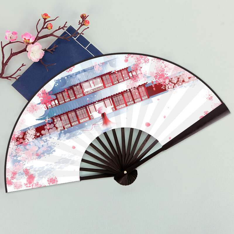 Chinese Snow Beauty Flower Tower with Cherry Blossoms Wooden Hand Fan ccfan213