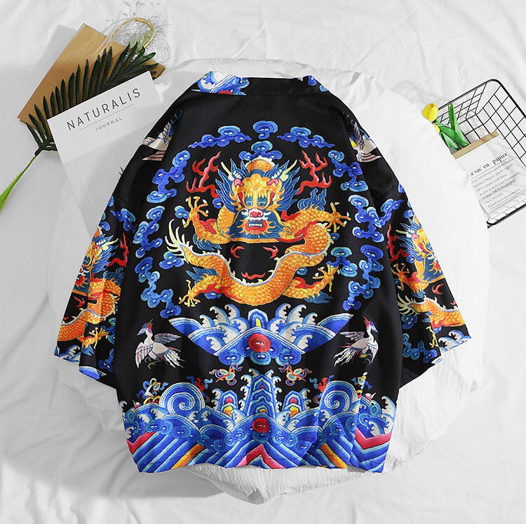 Womens Ladies Chinese Japanese Oriental Kimono Royal Dragon Black Top ltop19
