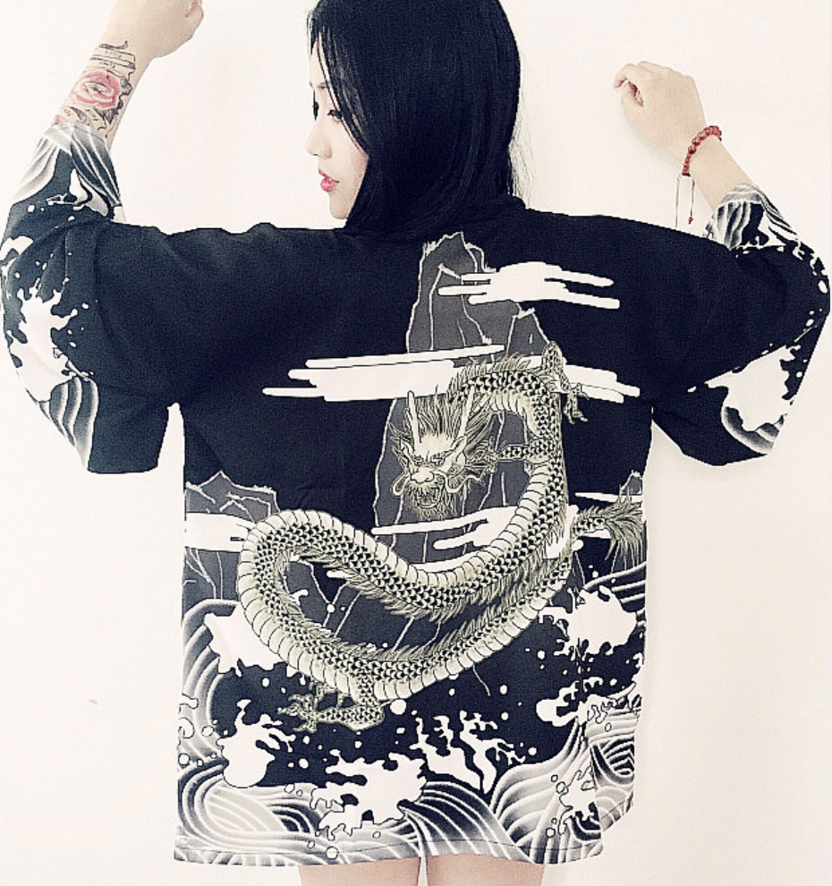 Womens Ladies Chinese Japanese Oriental Kimono Style Black Dragon Top ltop8