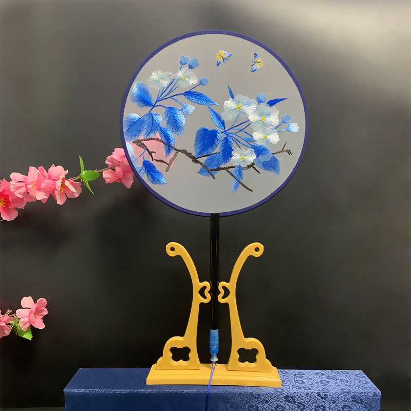 Chinese Double Sided Embroidered White Floral Blue Leaves Round Wooden Hand Fan