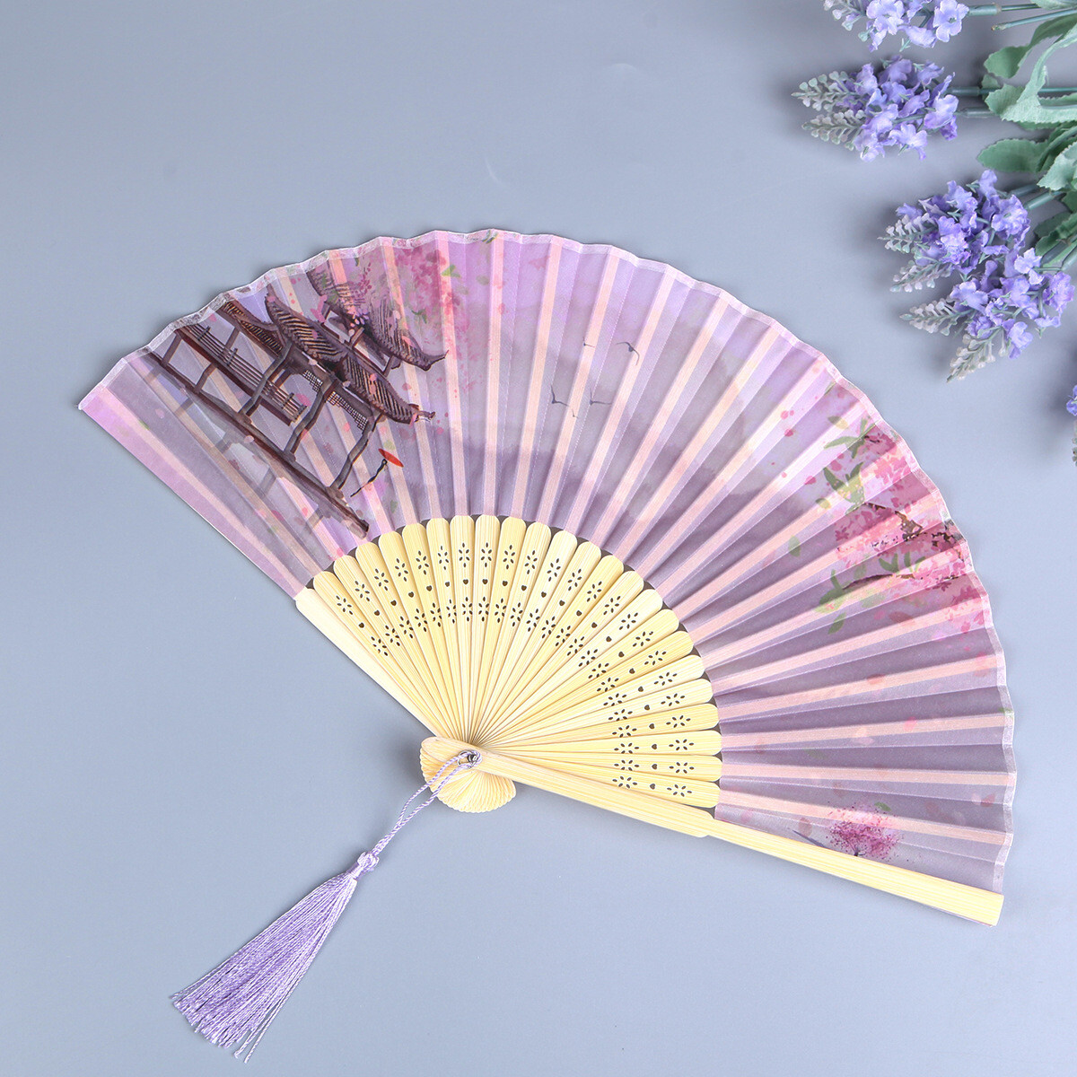 Chinese Mountain Scenery Cherry Blossom Pavilion Pink Wooden Hand Fan ccfan219