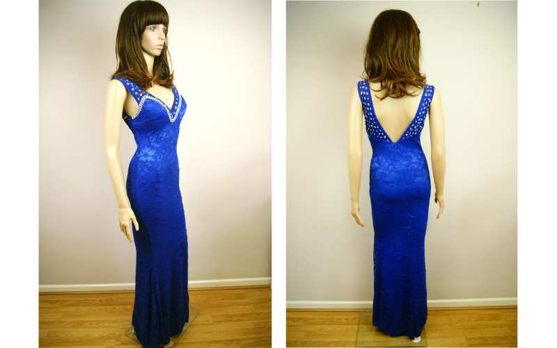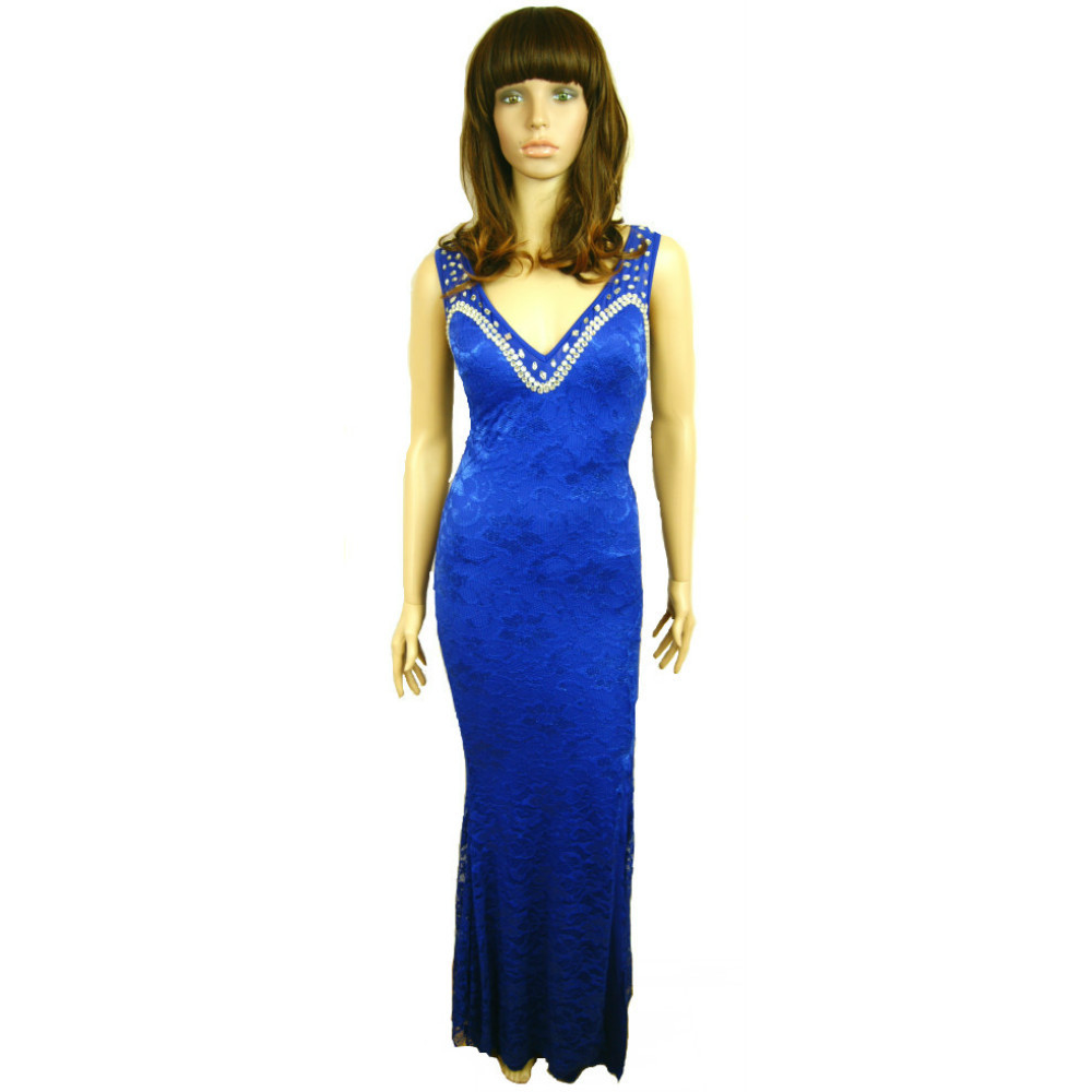 New Gorgeous Ladies Womens Blue Diamond Studs Metallic Floral Long Evening Dress