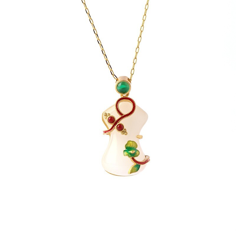 Chinese Ladies Qipao Shaped Gold-Plated Pendant Hetian Jade Enamel Necklace
