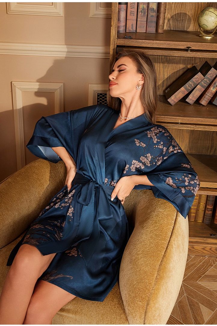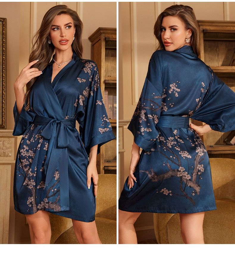 New Ladies Luxury Satin Dressing Gown – Elegant Navy Blue Floral Kimono Robe