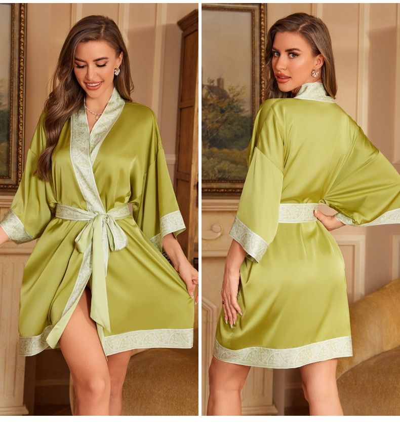 New Ladies Luxury Satin Kimono Dressing Gown – Elegant Green with Contrast Trim