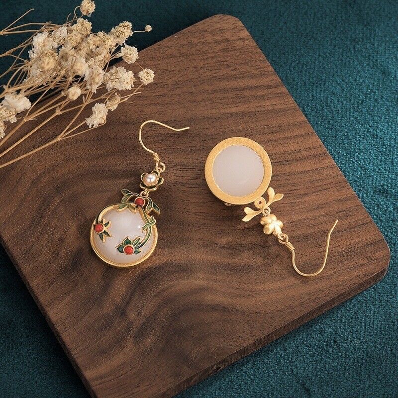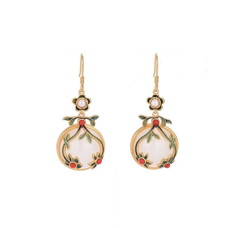 Introducing a harmonious blend of nature's finest gems in our New Ladies White Jade Floral and Southern Red Agate Earrings. Infused with the pristine beauty of white jade and the fiery passion of southern red agate, these earrings are delicately framed in a gold-plated setting and accentuated by lustrous pearls, making them a coveted piece for every sophisticated woman.