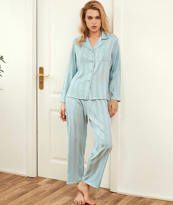 New Luxurious Satin Sky Blue Striped Womens Top & Trousers Pyjamas Set ladpj330