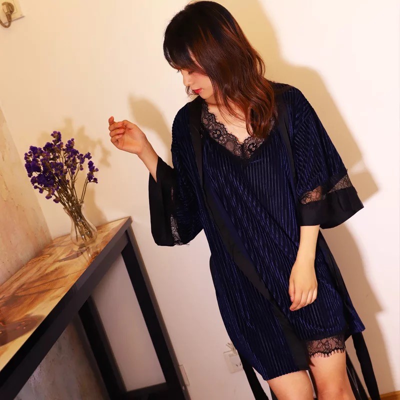 New Luxurious Velvet & Lace Ladies Womens Set of 2 Blue Kimono Nightie & Robe