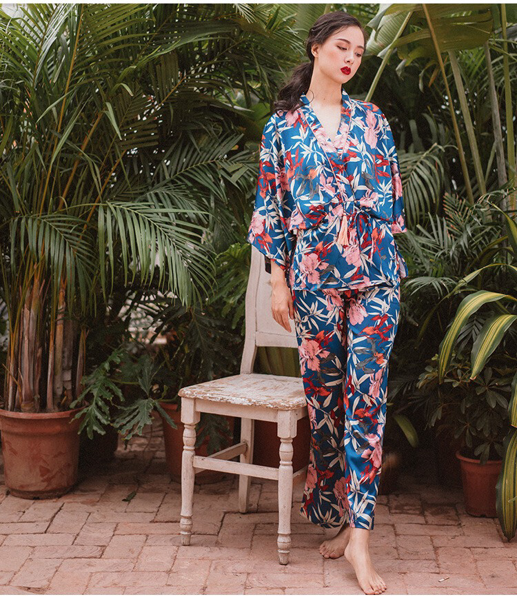 New Ladies Royal Blue Summer Flowers Kimono Top and Trousers Pyjamas ladpj277