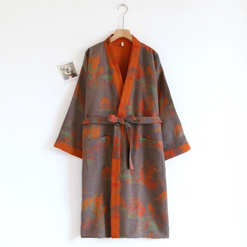 Women's Kimono Muted Blue-Grey Dressing Gown ? Cotton Robe with House Pattern