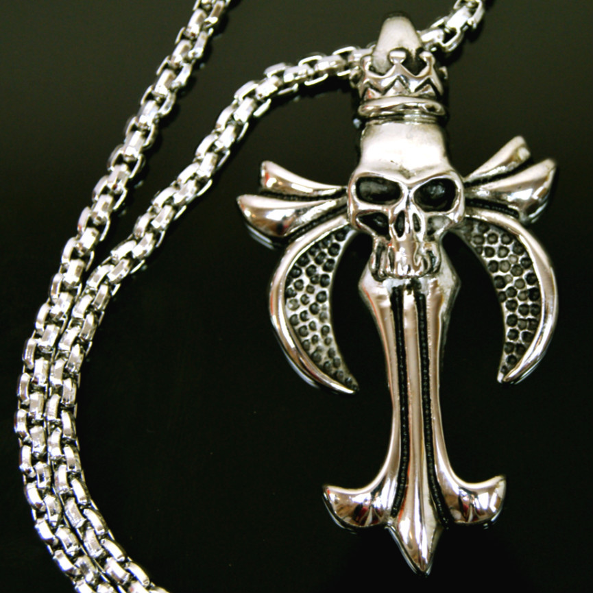 Stainless Horrific Gothic Cross Shape Skull Diamonds Pendant Chain Necklace Set